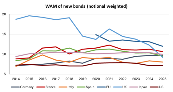 Before considering cross-currency flows, it is worth noting a broader backdrop: weighted-average maturities (“WAM”) of new sovereign issuance have been drifting lower across Europe, the US and Japan. Issuers are bringing shorter-dated supply to market, reflecting both refinancing needs and a more cautious approach to locking in long-term borrowing costs. As EUR sovereigns issue less at the long end, the relative scarcity of long-dated paper increases the appeal of the EUR market for foreign issuers, which can find deeper investor demand and greater capacity to absorb large-volume, longer-dated issuance than is available in their domestic markets.